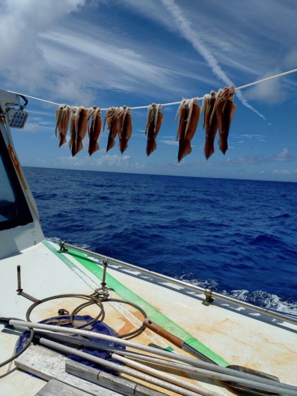 今日は朝から勝浦灯台沖でスルメイカ釣り、朝から水温高く、潮の流れ速すぎキツかったが潮型は良くポツポツと乗りました。中盤と後半はだんだん深場に出て、ポツポツと上がり良いお土産になりました。天気良くイカの沖干しも良く乾き、お土産になりました。